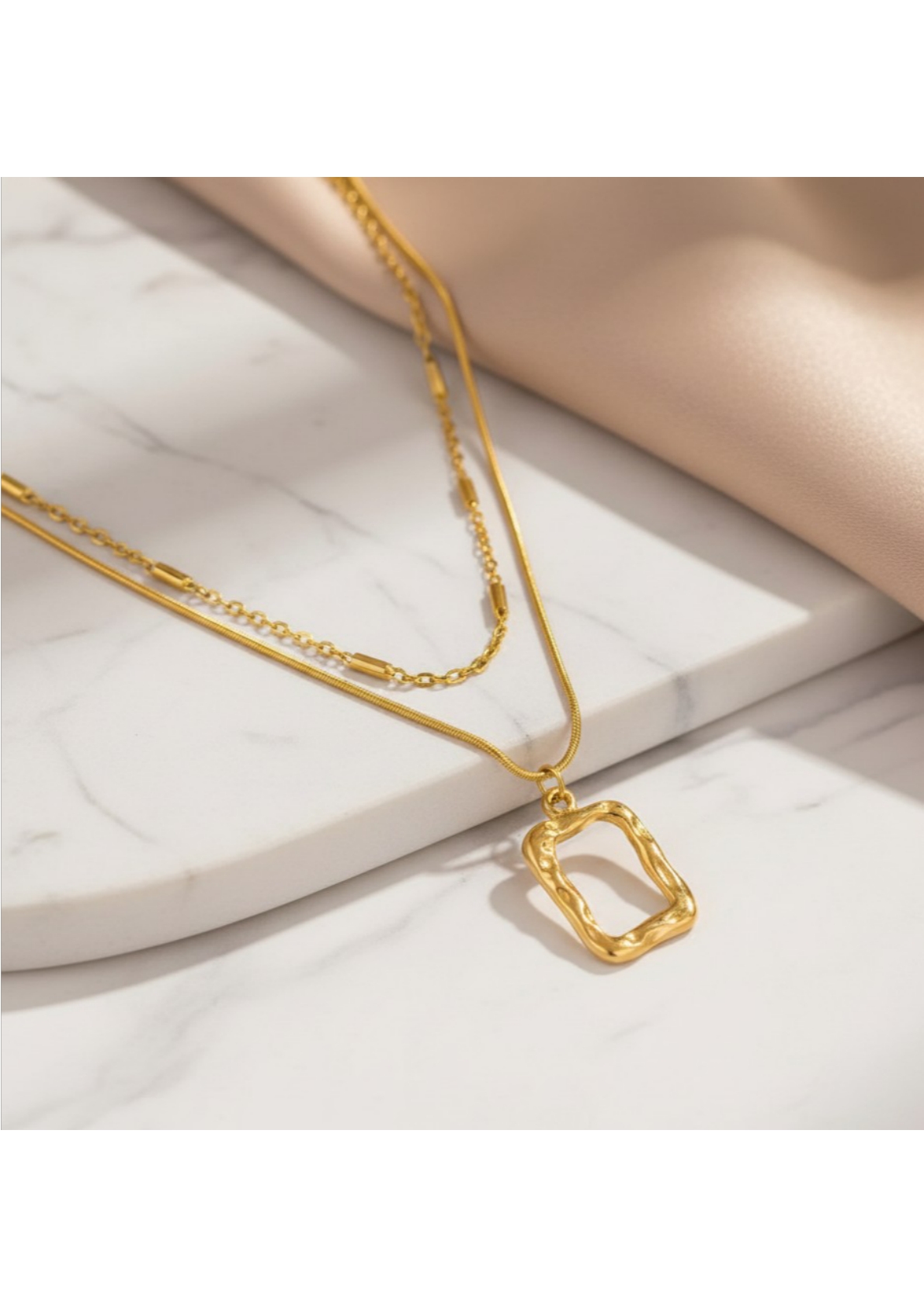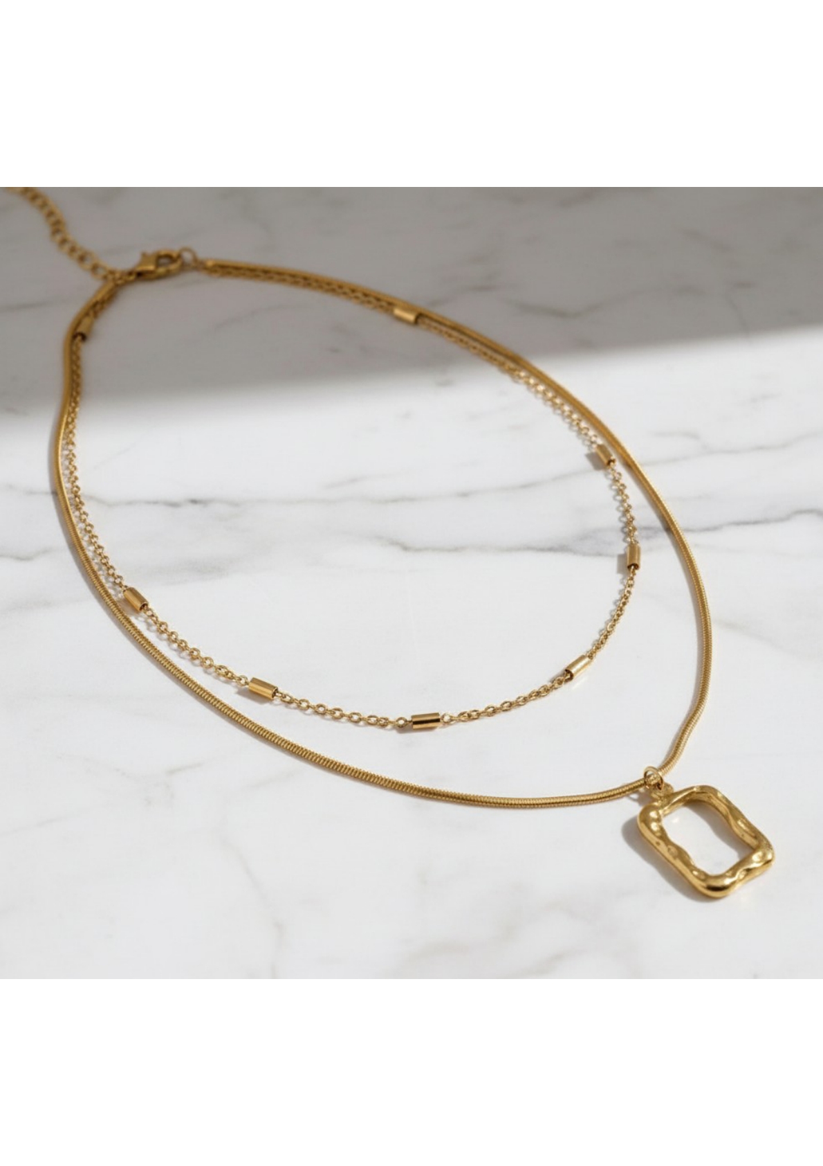 Make a chic statement with this Gold Plated Stainless Steel Anti Tarnish Dual Strand Geometric Necklace, a stylish accessory designed to add effortless elegance to any outfit. Crafted from premium stainless steel, it offers exceptional durability and a lasting golden shine.