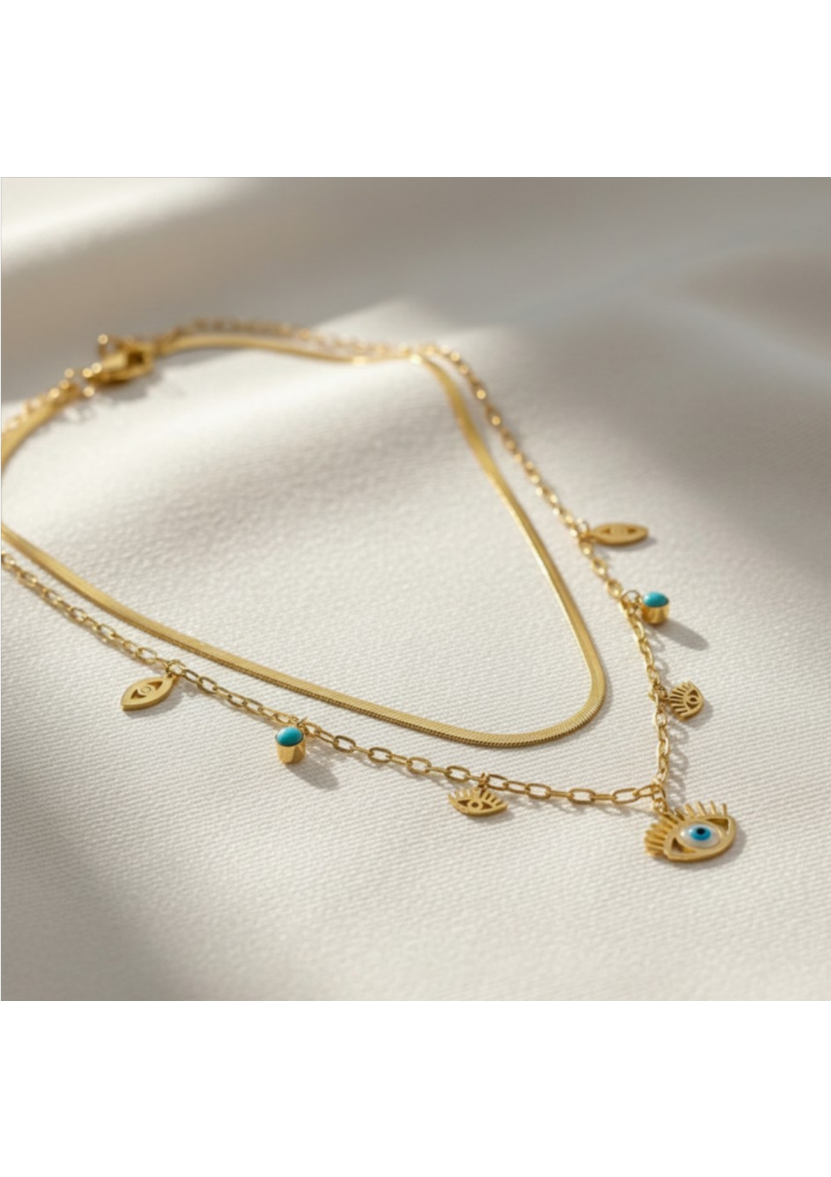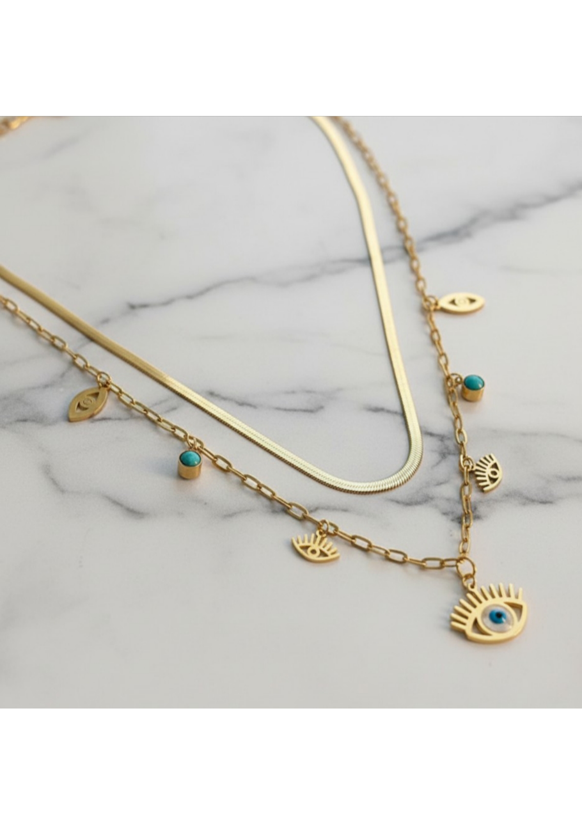 Gold Plated Stainless Steel Anti Tarnish Evil Eye themed Dual Strand Necklace For WomenGold Plated Stainless Steel Anti Tarnish Evil Eye themed Dual Strand Necklace For Women